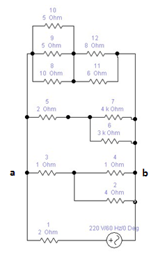 Определить эквивалентное сопротивление Rэкв электрической цепи постоянного тока и распределение токов по ветвям. Величины сопротивлений резисторов R1=2 Ом, R2=4 Ом, R3=1 Ом, R4=1 Ом, R5=2 Ом, R6=3 Ом, R7=4 Ом, R8=10 Ом, R9=5 Ом, R10=5 Ом, R11=6 Ом, R12=8 Ом, и питающего напряжения U=220 В. ![]()