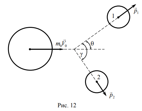 Нерелятивистская частица с внутренней энергией E0 и массой m0, летящая со скоростью V0 , распадается на две нерелятивистские частицы, скорости которых V1 и V2 , массы m1 и m2, импульсы 1 p и p2 , кинетические энергии E1 и E2. При этом часть внутренней энергии E0 исходной частицы в количестве E0, где коэффициент <1 , расходуется на увеличение кинетической энергии образовавшихся частиц. На рис. 12 γ - угол разлета частиц, т.е. угол, образованный векторами 1 p и p2 , - угол отклонения первой частицы (из вновь образовавшихся) от направления движения исходной частицы, т.е. угол, образованный векторами p0 и 1 p , где p0 m0V0 . Общие исходные данные: m* = 10-2 кг, V* = 10 м/с, γ* = /2, E* = 10 Дж , *=0,5. Другие исходные данные и искомые величины для каждого варианта задания представлены в таблице №3.