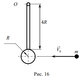 Физический маятник, состоящий из однородного шара радиусом R=3 см и массой М = 0,4 кг, жестко соединённого с однородным жёстким стержнем длиной 4R и массой M, подвешен к горизонтальной оси O, проходящей через верхний конец стержня перпендикулярно плоскости рисунка (рис.16).