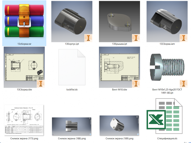 В архиве находится сама сборка в формате .iam и по отдельности крышка и корпус в форматах .ipt, а так же чертеж сборки и винтового соединения в форматах .idw. Есть спецификация в exel.