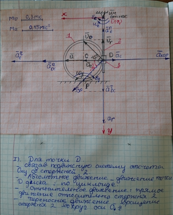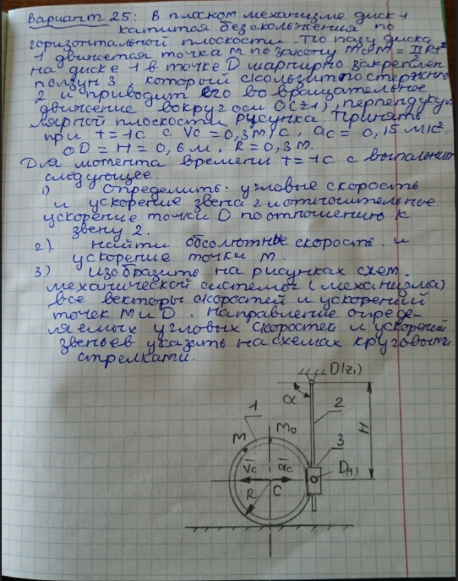 В плоском механизме диск 1 катится без скольжения по горизонтальной плоскости. По пазу диска 1 движется точка М по закону 2 0 Rt 2 M M . На диске 1 в точке D шарнирно закреплён ползун 3, который скользит по стержню 2 и приводит его во вращательное движение вокруг оси O(z1), перпендикулярной плоскости рисунка. Принять при t = 1 с VC = 0,3 м/с, aC = 0,15 м/с2 , OD = H =0,6 м, R = 0,3 м. Для момента времени t = 1 c определить: 1) угловые скорость и ускорение звена 1 и 2, а также относительное - по отношению к звену 2 - ускорение точки D; 2) абсолютные скорость и ускорение точки M.