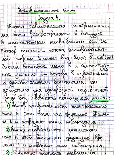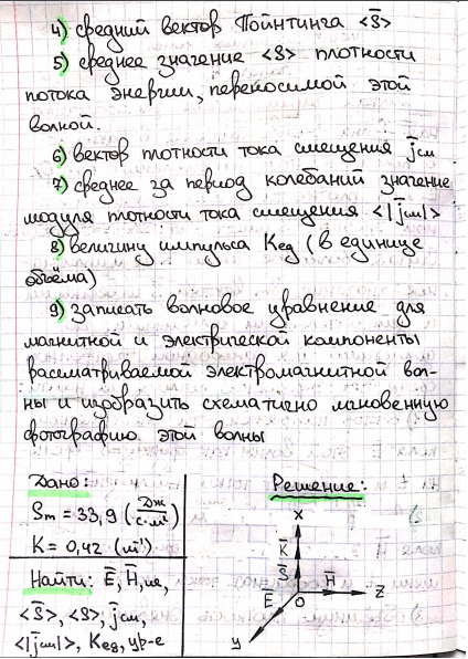 Плоская гармоническая электромагнитная волна распространяется в вакууме в положительном направлении оси Ox. Вектор плотности потока электромагнитной энергии S имеет вид: S x t S t k x m ( , ) cos ( 2 ). Считая волновое число k и амплитудное значение m S вектора S известными и действительными величинами, что допустимо для однородной изотропной среды без эффектов поглощения, найти: 1) вектор напряжённости электрического поля E этой волны как функцию времени t и координат точки наблюдения; 2) вектор напряжённости магнитного поля H этой волны как функцию времени t и координат точки наблюдения; 3) объёмную плотность энергии w ; 4 средний вектор Пойнтинга S ; 5) среднее значение S плотности потока энергии, переносимой этой волной; 6) вектор плотности тока смещения см j ; 7) среднее за период колебаний значение модуля плотности тока смещения см j ; 8) величину импульса Kед (в единице объёма). 9) записать волновое уравнение для магнитной и электрической компонент рассматриваемой электромагнитной волны и изобразить схематично мгновенную фотографию этой волны