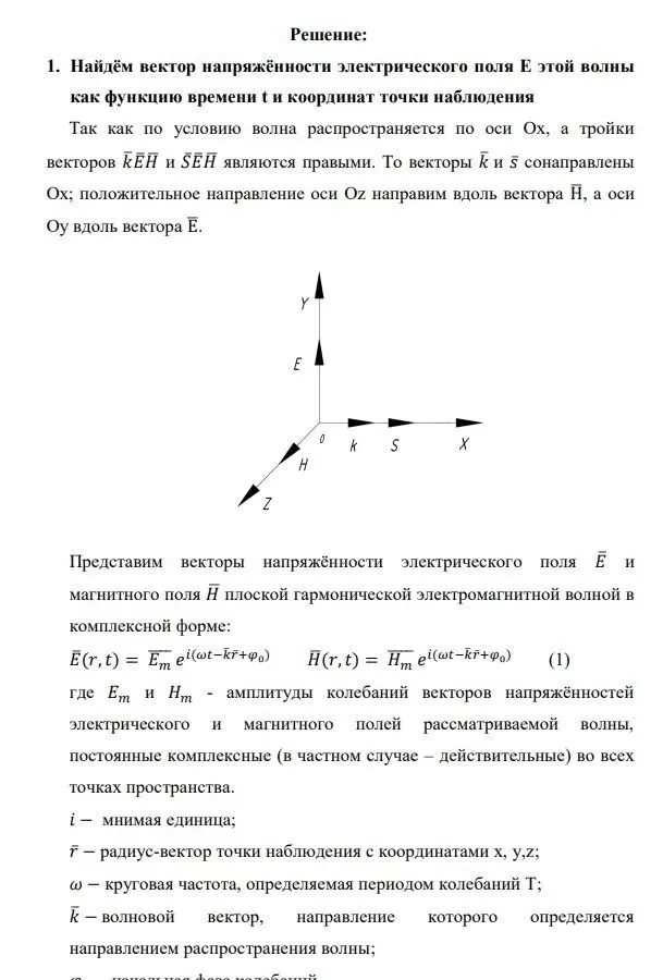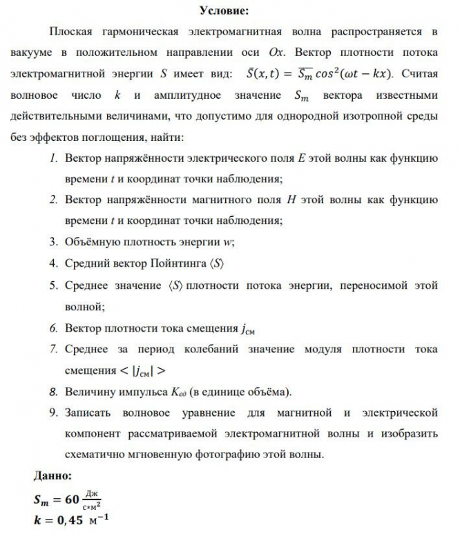Условие: Плоская гармоническая электромагнитная волна распространяется в вакууме в положительном направлении оси Ox. Вектор плотности потока электромагнитной энергии S имеет вид: . Считая волновое число k и амплитудное значение вектора известными действительными величинами, что допустимо для однородной изотропной среды без эффектов поглощения, найти: