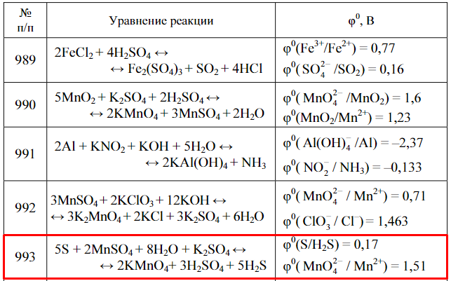 В задачах 989–1005 определите направление, в котором реакция может протекать самопроизвольно, используя окислительно-восстановительные потенциалы отдельных полуреакций, вычислите стандартную энергию Гиббса ΔrG0298 и константу равновесия реакции.