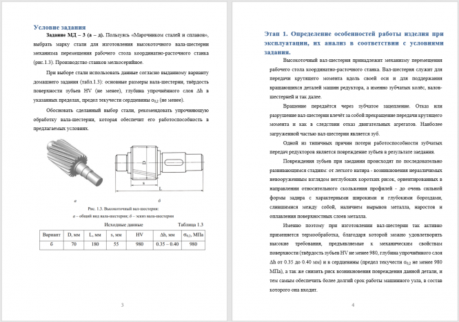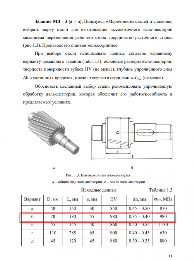 Задание МД - 3 (а – д). Пользуясь «Марочником сталей и сплавов», выбрать марку стали для изготовления высокоточного вала-шестерни механизма перемещения рабочего стола координатно-расточного станка (рис.1.3). Производство станков мелкосерийное. При выборе стали использовать данные согласно выданному варианту домашнего задания (табл.1.3): основные размеры вала-шестерни, твёрдость поверхности зубьев HV (не менее), глубина упрочнённого слоя Δh в указанных пределах, предел текучести сердцевины σ0,2 (не менее). Обосновать сделанный выбор стали, рекомендовать упрочняющую обработку вала-шестерни, которая обеспечит его работоспособность в предлагаемых условиях.