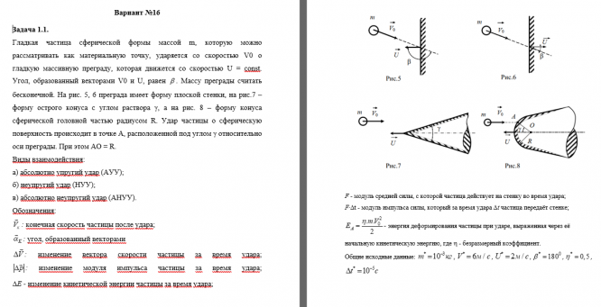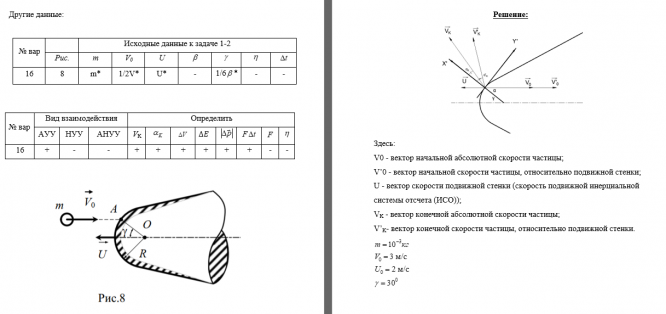 Задача 1.1. Гладкая частица сферической формы массой m, которую можно   рассматривать как материальную точку, ударяется со скоростью V0   о гладкую массивную преграду, которая движется   со скоростью U  =  const. Угол, образованный векторами V0   и U, равен  . Массу преграды считать бесконечной. На рис. 5, 6 преграда имеет форму плоской стенки, на рис.7 – форму острого   конуса с углом раствора γ, а на рис. 8 – форму конуса сферической головной частью радиусом   R. Удар частицы о сферическую поверхность происходит в точке А, расположенной под углом   γ относительно   оси преграды. При этом АО = R. Виды взаимодействия: а) абсолютно упругий удар (АУУ); б) неупругий удар (НУУ); в) абсолютно неупругий удар (АНУУ).