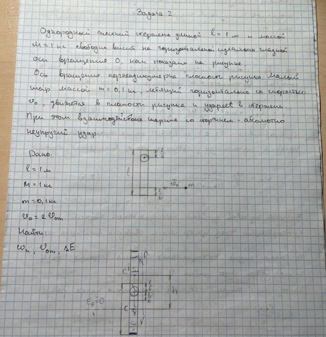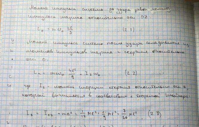 Сразу после удара стержень вращается с угловой скоростью 0, а шарик приобретает скорость и продолжает двигаться в плоскости рисунка. Другие обозначения: