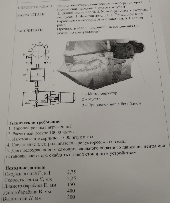 Для студентов МГТУ им. Н.Э.Баумана по предмету Детали машин (ДМ)Привод элеватора с коническим мотор-редуктором (коническая передача с круговым зубом)Привод элеватора с коническим мотор-редуктором (коническая передача с круговым зубом)