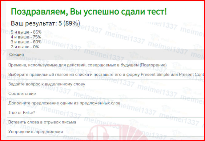 Для студентов ИДДО НИУ «МЭИ» по предмету Иностранный языкКМ-2. Времена, используемые для действий, совершаемых в будущем. Путешествие. Тестирование. - 89%КМ-2. Времена, используемые для действий, совершаемых в будущем. Путешествие. Тестирование. - 89%