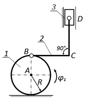 φ1 = 2t2 – 6t рад, R = 0,5 м,ВC = CD = 1,0м.