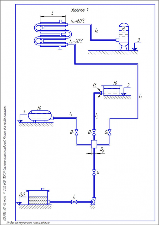 Исходные данные к проекту: Длины участков, м: l1=8 l2=13 l3=16 l4=1 l5=2 l6=3. Отметки установки приемных емкостей, м: z1=6 z2= 12 z3= 15. Свободный напор в точках потребления, м: H1=5 H2=10 H3=8. Расходы через ответвления, м3/ч: Q1=6 Q2=3 Q3=4. Диаметр расширительной емкости, м: Dp= 0,3. Угол раскрытия дифузора, α = 4. Длина теплообменника: L,м = 1,2.