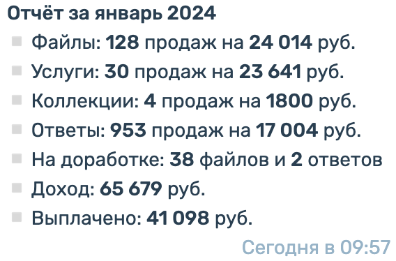 - Файлы, услуги, коллекции и ответы: количество продаж без учёта жалоб и возвратов за указанный период. Выручка с продаж в рублях. То есть это цена умноженная на количество продаж без учёта комиссии. Указывается с разделениям по типам. Обратите внимание, что здесь также не учитывается гарантия. Файлы, услуги и коллекции продаются с гарантийным периодом, то есть деньги за них зачислятся после того, как пройдёт гарантийный период.