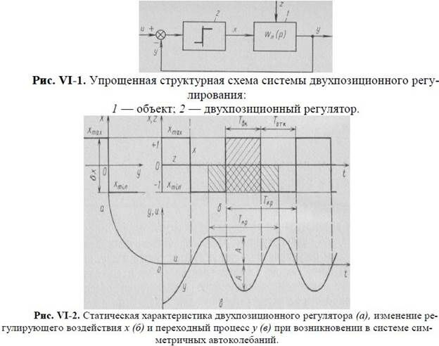 Системы двухпозиционного регулирования имеют в своем составе двухпозиционный или Пз-регулятор, выходная величина которого может принимать только два значения, соответствующих максимальной хтах и минимальной хтiп величинам регулирующего воздействия. Такие системы относятся к нелинейным. В простейшем случае структурная схема системы двухпозиционного регулирования (рис. VI-1) может быть представлена в виде последовательного соединения Пз-регулятора и линейной части системы, охваченных отрицательной обратной связью.