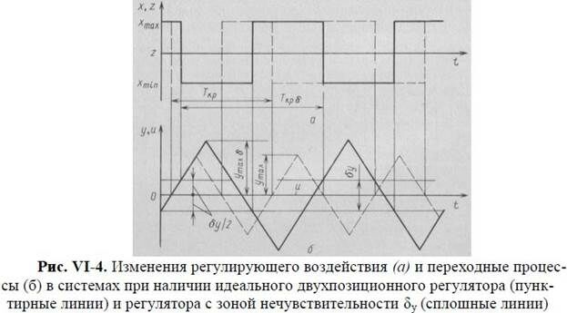 Из рассмотрения влияния различных факторов на качество двухпозиционного регулирования следует, что для повышения качества регулирования необходимо уменьшать зону нечувствительности регулятора и, если это возможно, уменьшать пределы изменения регулирующего воздействия регулятора.