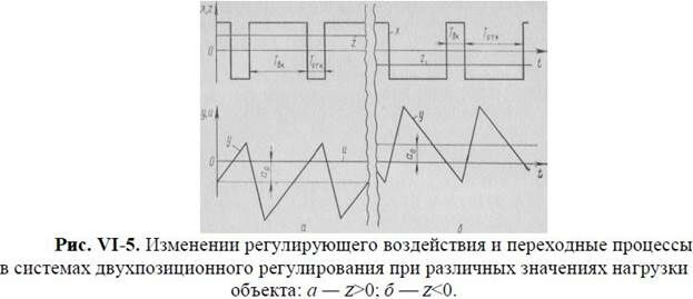 Для работоспособности системы двухпозиционного регулирования необходимо, чтобы при равенстве передаточных функций объекта Wx(p) и Wz(p) по каналам х→у и z→y текущие значения эквивалентного возмущения объекта zэкв лежали бы в пределах xmax > z > xmin. Последнее условие соответствует случаю, когда основным возмущением z является нагрузка объекта, изменение которой компенсируется регулирующим воздействием.