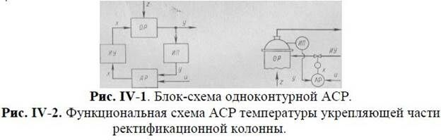 Блок-схема АСР приведена та рис. IV-1. АСР представляет собой замкнутую цепь, состоящую из объекта регулирования ОР, измерительного преобразователя ИП, автоматического регулятора АР и исполнительного устройства ИУ. Возмущающее воздействие z приводит к отклонению регулируемой технологической величины объекта у от заданного значения и. Информация об изменении регулируемой величины воспринимается измерительным преобразователем системы ИП и передается на автоматический регулятор АР. Последний сравнивает текущее значение регулируемой величины у с заданным и и в зависимости от знака и величины рассогласования по заранее заложенному в регулятор закону (алгоритму) вырабатывает регулирующее воздействие х, которое через исполнительное устройство ИУ направляется на объект регулирования ОР и приводит к ликвидации или уменьшению этого рассогласования. Таким образом, причина, вызвавшая срабатывание регулятора, в свою очередь, находится под его обратным воздействием.