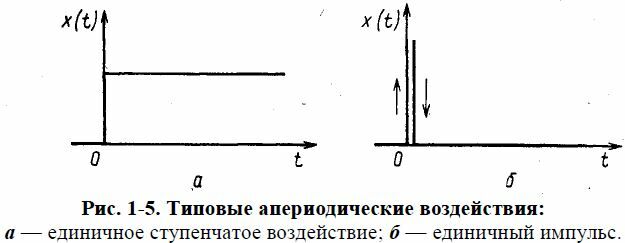 Временная характеристика системы представляет собой изменение выходной величины во времени при подаче на ее вход типового апериодического воздействия. В качестве последнего используют единичное ступенчатое воздействие, или единичный импульс. При единичном ступенчатом воздействии (рис. 1-5, а) входная величина мгновенно возрастает от нуля до единицы и далее остается неизменной. Единичное ступенчатое воздействие, или единичная ступенчатая функция 1(t) описывается выражением: