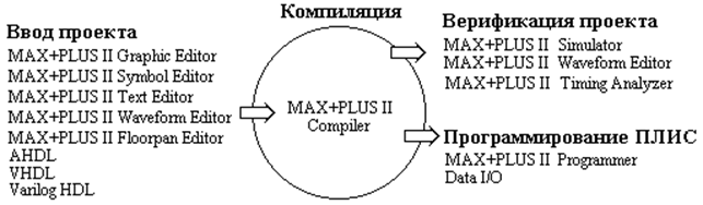 Система MAX+PLUS II предлагает полный спектр возможностей логического дизайна:
