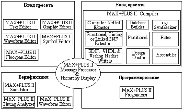 Состав ПО системы MAX+PLUS II. Представленный на рисунке 14.1 состав ПО системы MAX+PLUS II является полным комплектом, обеспечивающих создание логических дизайнов для устройств фирмы Altera с программируемой логикой, в том числе семейства устройства Classic, MAX 5000, MAX 7000, MAX 9000, FLEX 6000, FLEX 8000, и FLEX 10K. Информация о других поддерживаемых семействах устройств фирмы Altera приведена в файле read.me в системе MAX+PLUS II.