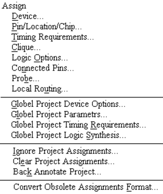 Рисунок 14.4 – Меню назначений проекта Assign | Сигнальные проекты создаются в сигнальном редакторе MAX+PLUS II. Файлы формата Xilinx, разработанные другими стандартными инструментами системы EDA, могут быть импортированы в среду MAX+PLUS II. Назначения параметров проекта. Во всех приложениях MAX+ PLUS II есть возможность с помощью команд из меню Assign (Назначить) вводить, редактировать и удалять типы назначений ресурсов, устройств и параметров, которые управляют компиляцией проекта, в том числе логическим синтезом, разделением на части и подгонкой. На рисунке 14.4 представлены команды меню Assign. Следующие функции являются |