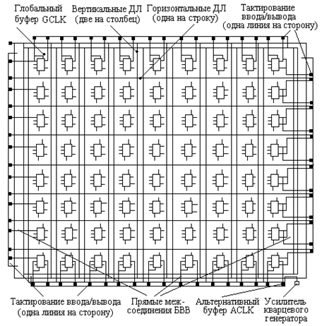 Конфигурируемые логические блоки расположены в виде матрицы в центре кристалла ПЛИС. Строки и столбцы матрицы обозначаются буквами А, В, С, D и т.д., которые используются для задания имени (адреса) блока, например, блоки AA, AD, HH. Разработчик аппаратуры может присвоить блоку новое имя для обозначения, например, узла схемы, занимаемого этим блоком. В этом случае блок будет иметь два имени.
