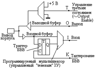 пряжение 2,2 В). Буферизованный входной сигнал поступает на вход данных триггера и на один из входов программируемого мультиплексора. Выходной сигнал триггера поступает на другой вход мультиплексора. Наличие программируемого мультиплексора даёт возможность пользователю выбрать либо прямой ввод сигнала, либо ввод с запоминанием на триггере. Расположенные входы на одной стороне кристалла БВВ, используют общие синхронизирующие импульсы, поступающие на вход К. Триггеры сбрасываются в 0 в процессе установления конфигурации, а также входом RESET, имеющим активный нижний уровень (при переходе этого сигнала в логический 0).