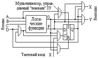 Каждый КЛБ имеет два выхода X и Y, четыре входа общего назначения А, В, С и D, а также специальный вход синхронизации (тактовый вход) К.
