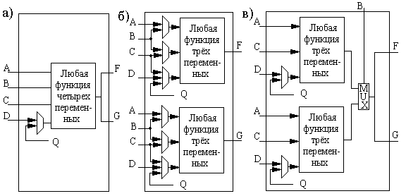 Рисунок 6.4 – Варианты конфигурации функций в МС серии ХС2000: а) – одна функция четырёх переменных; б) – две функции трёх переменных; в) – динамический выбор одной из двух функций трёх переменных