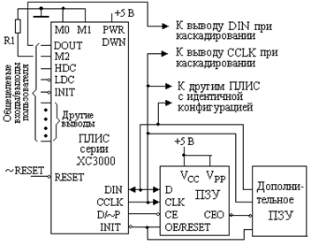 Конфигурирование ПЛИC серии ХС3000. На рисунках 8.1, 8.3, 8,5, 8.7 приведены схемы конфигурирования ПЛИС. Показанный на схемах резистор R1 позволяет использовать  вывод  М2  после  конфигурирования  как обычный