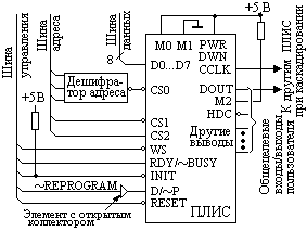 Периферийный режим конфигурации (см. рисунок 8.5) предполагает наличие вспомогательного дешифратора адреса, подключаемого к системной шине. Когда на выходе этого дешифратора (и, следовательно, на входе CSO) устанавливается сигнал логического 0, а на входы CS1 и CS2 подаются сигналы 0 и 1 соответственно, то ПЛИС подготавливается к приёму одного байта би-