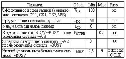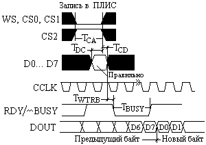 именем сигнала). Этот байт запоминается по заднему фронту сигнала WS и затем записывается в «теневое» ЗУ. На время записи ПЛИС вырабатывается сигнал «Занято» (Busy) – логический 0 на выводе RDY/~BUSY.