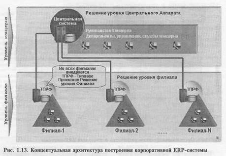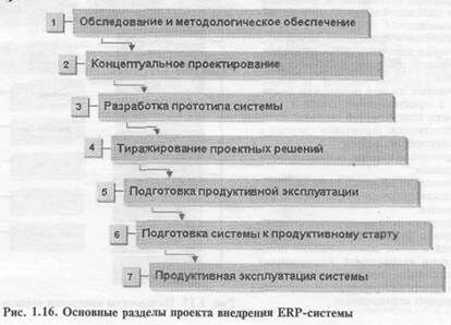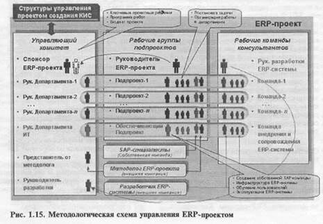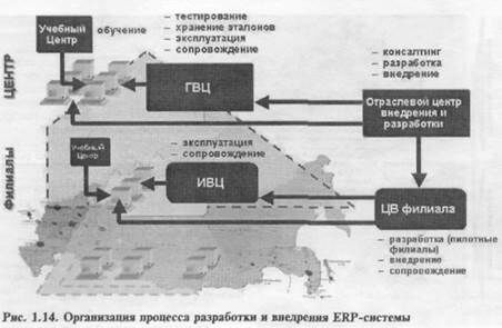 Проект внедрения ERP-системы можно представить в виде укрупненного плана-графика (рис. 1.18, см. третью сторону обложки). Б красной зоне изображены проекты уровня Центра (основные и