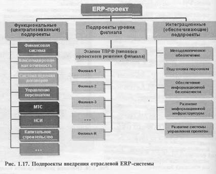 Структура проекта внедрения ERP-системы образуется из трех направлений но подпроектам (рис. 1.17):