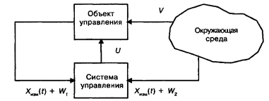 Здесь t — время, Хизм(t) — вектор измеряемых параметров, характеризующих состояние управляемого объекта (измеряемая часть вектора фазовых координат), Zизм(t) — вектор измеряемых параметров, характеризующих состояние окружающей среды, U — управляющее воздействие, V— воздействие окружающей среды, W — информационные возмущения. В общем случае U, V, W могут зависеть от Х и t.