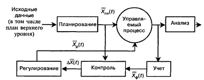 Планирование заключается в выработке плановой «траектории» процесса X(t) на период планирования {t0 ,tпл}. Учет, т. е. измерение, в производственных системах состоит в определении в заданные моменты времени истинного состояния процесса Хф(t). Контроль позволяет определить отклонение Xф(t) от Х пл(t), а регулирование состоит в определении скорректированного плана Хp(t), т. е. по существу является решением задачи планирования при новых начальных условиях.