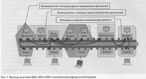 В этом смысле SOA и EDA взаимно дополняют друг друга. Архитектура SOA позволяет легко и быстро создавать новые и перестраивать имеющиеся ресурсы в соответствии с меняющимися условиями бизнеса. Архитектура ЕDA, со своей стороны, позволяет автоматически и без временных задержек инкорпорировать данные о происходящих событиях.