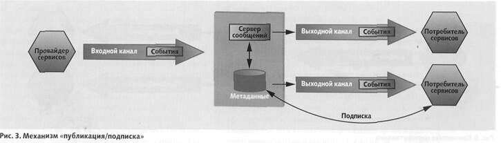 Механизм «публикация/подписка » в некоторых случаях ассоциируют с EDA, хотя он точно так же может быть использован и для создания SОA. Потребитель подписывается па сведения об определенных категориях событии, описывая средствами метаданных интересующие его события. Провайдер сервисов или промежуточное звено анализирует заявку и передает сведения о событиях подписчику.