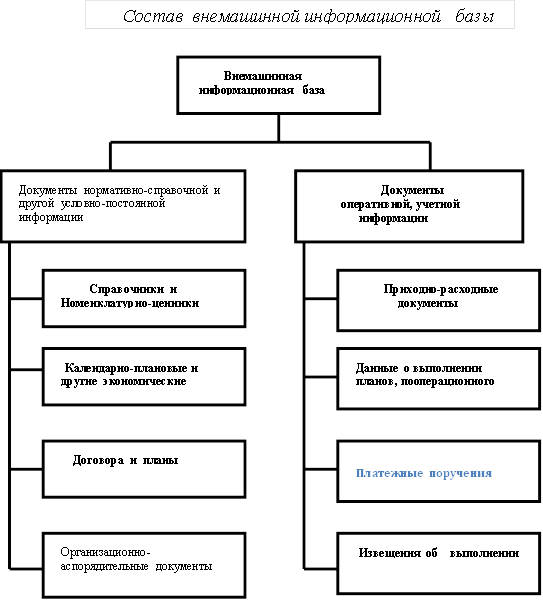 Внемашинное информационное обеспечение включает внемашинную информационную базу (ВИБ) и средства ее организации и ведения. ВИБ включает нормативно-справочную, плановую (т.е. условно-постоянную) информацию и оперативную (учетную) информацию некоторой предметной области.