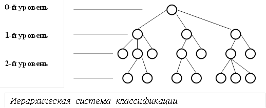 В иерархической системе классификации каждый объект на любом уровне должен быть отнесен к одному классу, который характеризуется конкретным значением выбранного классификационного признака. Для последующей группировки в каждом новом классе необходимо задать свои классификационные признаки и их значения. Таким образом выбор классификационных признаков будет зависеть от семантического содержания того класса, для которого необходима группировка на последующем уровне иерархии. Количество уровней классификации соответствует числу признаков, выбранных в качестве основания деления, характеризует глубину классификации. Достоинства иерархической системы классификации: