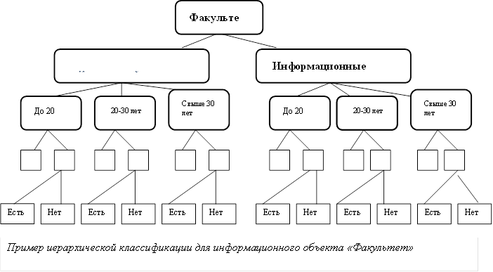 Пример. Поставлена задача – создать иерархическую систему классификации для информационного объекта «Факультет», которая позволит классифицировать информацию обо всех студентах по следующим классификационным признакам: факультет на котором он учится, возрастной состав студентов, пол студента, для женщин – наличие детей.