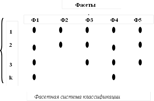 Пример. Для сопоставления разработаем фасетную систему классификации для вышеприведенного примера. Сгруппируем и представим в виде таблицы все классификационные признаки по фасетам: