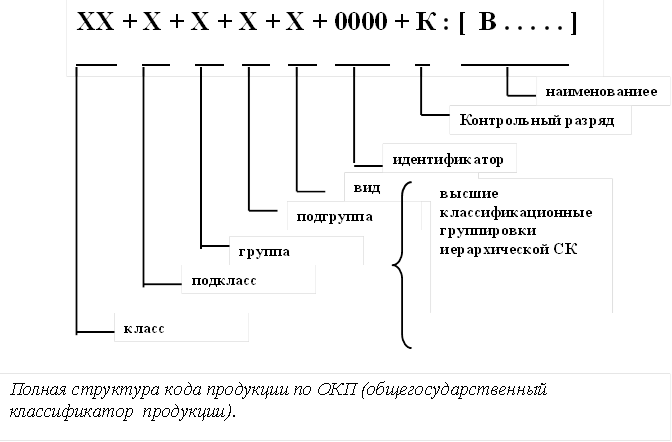 Классификаторы. Документ, содержащий описание классификационных группировок, структуру кода и наименования объектов, называется классификатором. Или кодификатором. Классификаторы могут иметь различную степень локализации, в пределах предприятия, отрасли, государства. Примерами классификаторов, используемых на общегосударственном уровне, являются классификаторы промышленной и сельскохозяйственной продукции, классификатор предприятий и организаций, профессий и должностей. В пределах предприятия используются локальные классификаторы структурных подразделений, готовой продукции, материалов и комплектующих и т.п. На рисунке приведена полная структура кода по общегосударственному классификатору промышленной и сельскохозяйственной продукции.