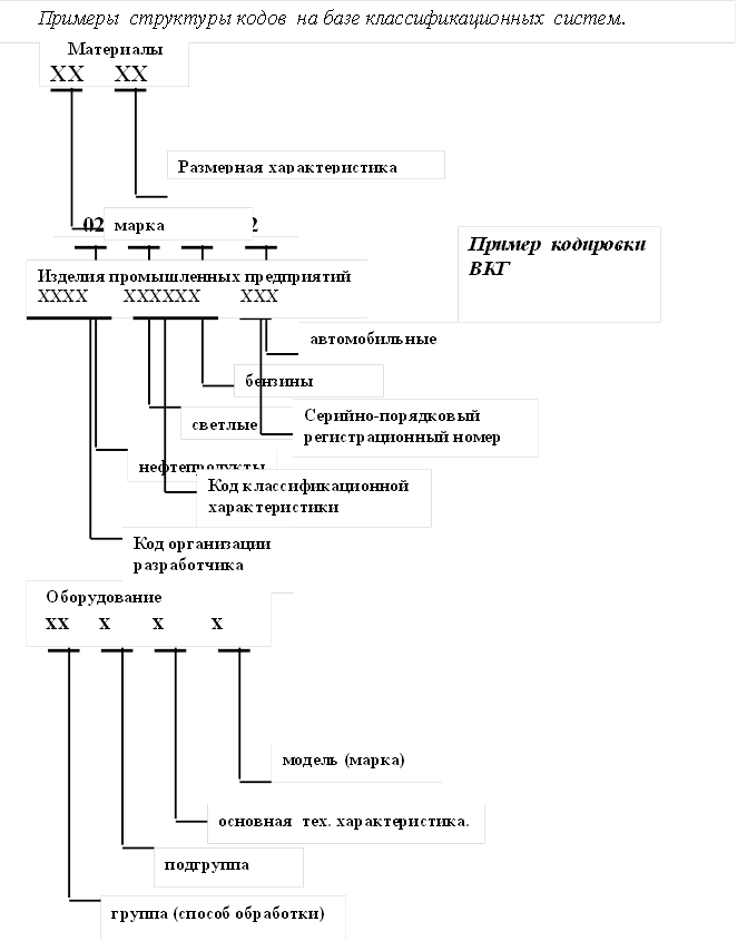 В структуре кода используются следующие обозначения : Х – для признака с цифровым алфавитом, В – для признака с буквенным алфавитом, 0 – для порядкового кода с цифровым алфавитом, + - знак иерархической системы классификации, : - знак фасетной системы классификации.