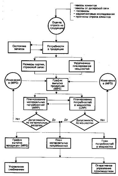 На рис. 14 показаны основные элементы систем планирования потребностей в ресурсах. Здесь выясняется, можно ли получить не­обходимые материальные ресурсы от поставщиков и достаточны ли производственные мощности, чтобы обеспечить выполнение гра­фика выпуска продукции. Если экономически обоснованные воз­можности недостаточны, то график должен быть изменен. После того как определено, что график выпуска продукции допустим, планы потребностей в материальных ресурсах и мощностях стано­вятся ядром краткосрочного плана производства. Исходя из плана потребностей в материальных ресурсах службы снабжения форми­руют план поставок всех приобретаемых материальных ресурсов, а службы управления производством составляют оперативные произ­водственные планы.