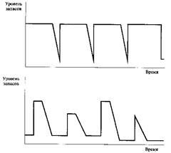 На рис. 15 показана динамика уровня запасов при использовании системы МRР. Когда объем заказа фиксирован, применяется поли­тика «точки заказа». При этом заказанное количество плюс страхо­вой запас хранятся в запасах до тех пор, пока конечная продукция, в которой данные материалы и полуфабрикаты применяются, не попадет в график выпуска продукции. Но так как в ожидании попа­дания в график может пройти длительное время, то в итоге боль­шую часть времени система будет работать с высоким уровнем запа­сов, а время с низким уровнем будет относительно невелико. Напротив, в MRP заказы на материальные ресурсы возникают синх­ронно с появлением изделия в графике выпуска продукции. Итогом является значительное снижение среднего уровня запасов и затрат на них.