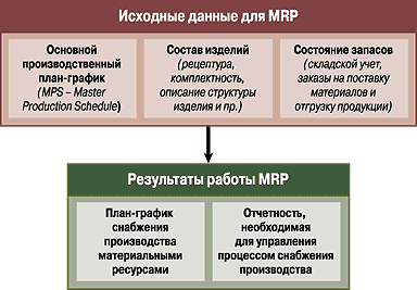Входами в MRP являются график выпуска продукции и данные состояния запасов и состава продукции. Эта входная информация обрабатывается программными средствами MRP. В результате выда­ется следующая выходная информация: обращение к данным состо­яния запасов, которые поддерживают данные в актуализированном состоянии; спланированные заказы для обеспечения графика; отче­ты, обеспечивающие управленцев информацией для решения задач управления производством.