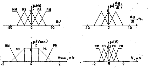 и сигнала управления скоростью V задаются по 5 термов (NM, NS, Z, PS, PM); для угловой скорости