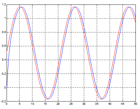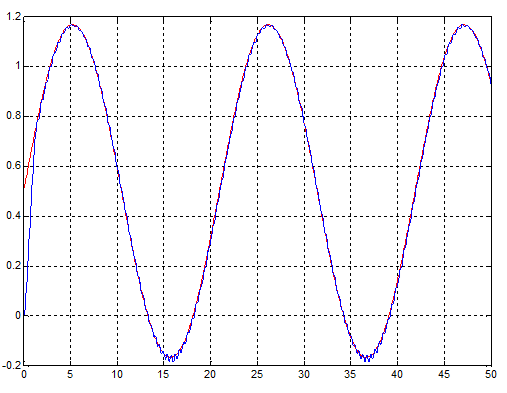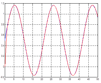 Рис. 29. Переходный процесс при гармоническом входном воздействии для модели с оптимизированным нечетким регулятором, содержащим одну входную лингвистическую переменную.