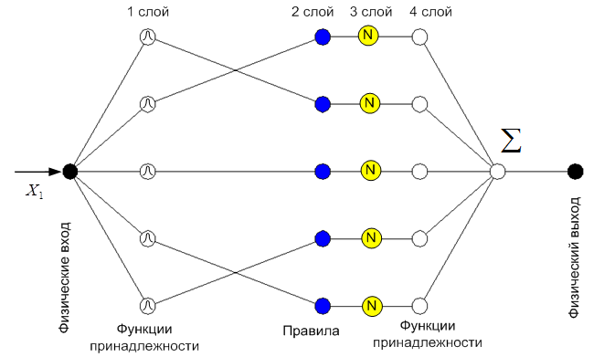 соединены только со своими термами. Количество узлов первого слоя равно сумме мощностей терм-множеств входных переменных. Выходом узла являются степень принадлежности значения входной переменной соответствующему нечеткому терму: