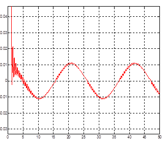 Рис.30. Сигнал ошибки при гармоническом входном воздействии для модели с нечетким регулятором, содержащим две входные лингвистические переменные.
